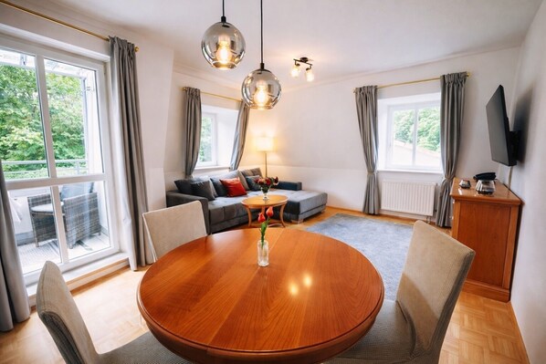 In absoluter Ruhe, aber dennoch nur wenige Schritte von der Fußgängerzone entfernt, genießen Sie in einem architektonisch anspruchsvollen Haus von Ihrem Balkon oder der Sonnenterrasse den Blick auf ein faszinierendes Bergpanorama. Die Apartments sind im klassisch-eleganten Stil eingerichtet und haben eine Größe zwischen 45 und 98 qm. Sie bieten bis zu vier Personen Platz und verfügen alle über getrennte Wohn- und Schlafräume, Bad und Balkon. Unser Haus ist mit Panoramaaufzug, Innenlift, Waschküche, Fahrradraum, sowie einer Tiefgarage ausgestattet. Außerdem verfügen wir über eine Lounge mit Getränkekühlschrank (Selbstbedienung). Hunde sind willkommen. Das großzügige Appartement verfügt über zwei Schlafzimmer mit Doppelbett bwz. zwei Einzelbetten (Boxspringmatratzen), ein Wohnzimmer mit Essecke, eine große Küche sowie ein Bad mit Dusche und Badewanne. Von Ihrem Balkon (Ostseite) aus können Sie den Blick in die Natur genießen, wo sie mit etwas Glück manchmal Rehe oder Hasen beobachten können.