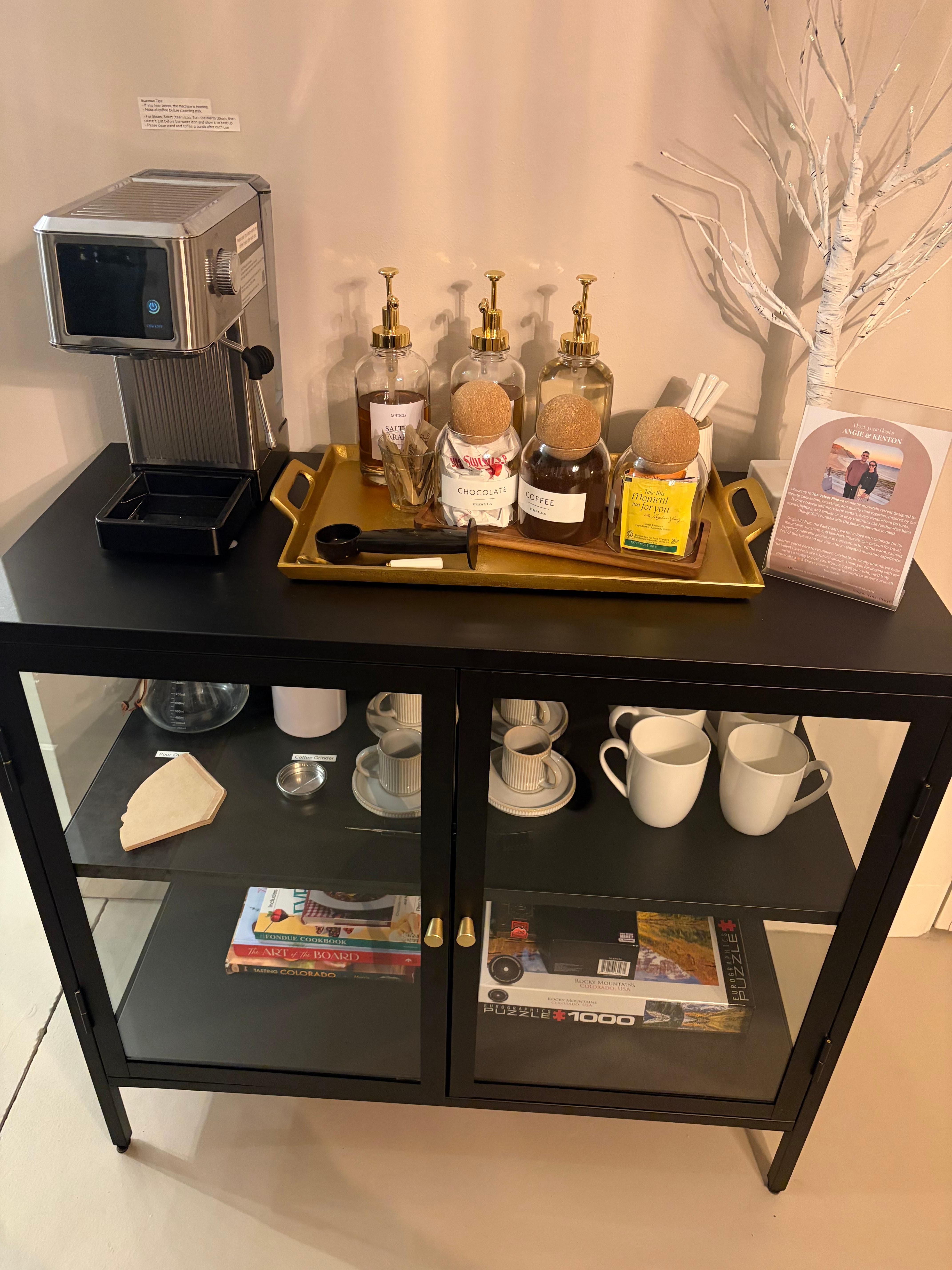 - dedicated, fully stocked coffee bar with pour-over and espresso coffee makers