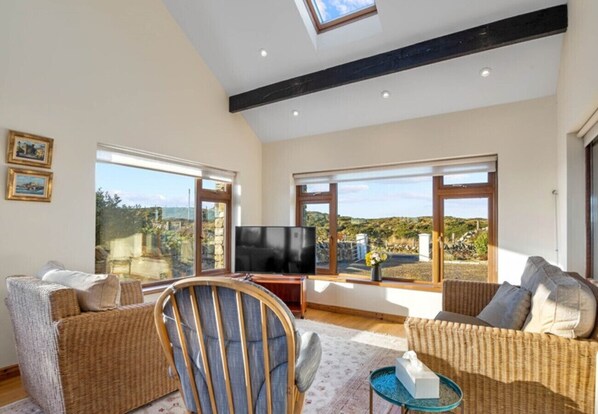 The main living room is a bright and spacious room offering ample natural light. There is a sofa, an armchair, and a rocking chair. 50″ Sony Smart TV. The dining table seats up to 6 guests.