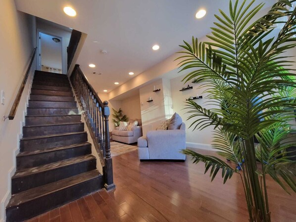 We arrived after dark after a long drive. When we got there, there was no designated parking spot for us even though we were assured before booking there would be. Parking is on the street wherever you can find a place. We parked in the closest space we could find. There were people outside right beside my car looking at us. No one said "hello", and we ( 2 females) felt extremely unsafe. There's a very sketchy alley with trash and other things beside the apartment. It took forever to figure out the lock box. The bedrooms are up a steep flight of old wooden stairs that creak. There are 2 bedrooms, but neither bedroom had any night stand or side table or anywhere to put your phone or a glass of water or anything. One bedroom did have a TV on the wall, but we couldn't find a remote anywhere (again, there's nowhere to even put a remote unless you just leave it on the floor). We finally found it in the window hidden under the shades. It didn't have any batteries. We brought some from my car to put in it. The other bedroom did not have a TV or nightstand or anything other than just a bed. The kitchen is downstairs, but there is no kitchen table. It's probably too small for a table. The smoke alarm was hanging down by wires. There was a dark basement that could not be locked from inside the apartment. It could only be locked if you were in the basement on that side. The basement goes down to the street, so anyone can come up. The host refused any refund. We left .