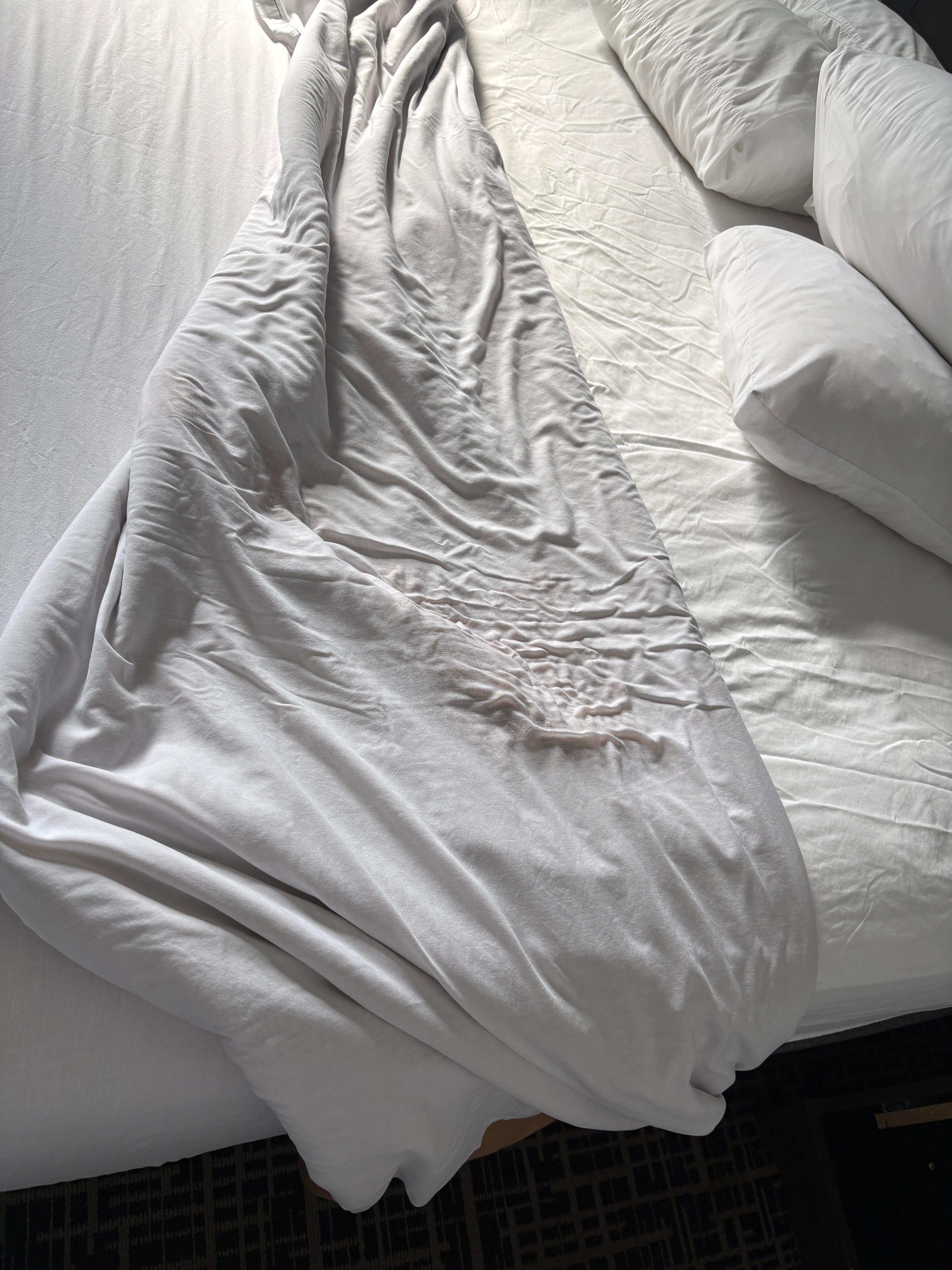Room was a mess. Burn holes, clogged drains, taped down tiles