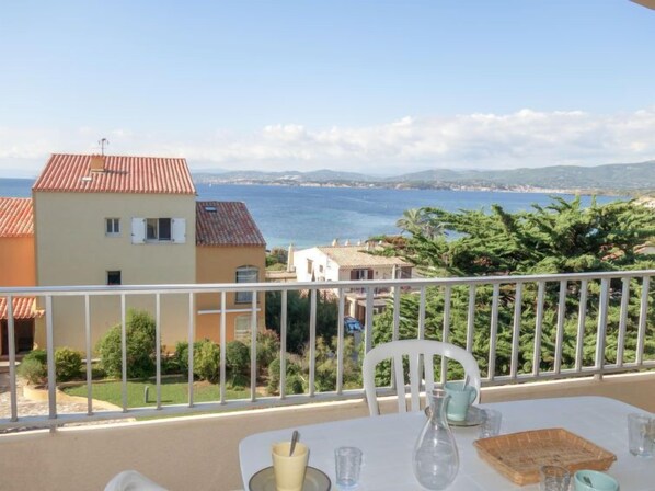2-Zimmer-Wohnung 50 m2 auf 2 Stockwerken im 3. Stock. Geräumig: Wohn-/Esszimmer mit 1 Doppeldiwanbett (130 cm, Länge 190 cm), TV. Ausgang zur Terrasse. Küche (2 Kochplatten, Backofen, Geschirrspüler, Mikrowelle, Tiefkühler) mit Durchreiche. Dusche/WC. Obergeschoss: offene Galerie mit 1 Bett (90 cm, Länge 190 cm), 1 franz. Bett (140 cm, Länge 190 cm). E-Heizung. Terrasse 10 m2, überdacht, Westlage. Terrassenmöbel. Sehr schöne Sicht auf das Meer. Zur Verfügung: Waschmaschine. Parkplatz Nr. 13 (überdacht), Höhe 200 cm, Breite 220 cm. Bitte beachten: TV nur FR. Rauchmelder, kein Fahrstuhl. Anstelle eines abgeschlossenen Schlafzimmers befinden sich manche Schlafplätze in einem offenen Bereich (Galerie, Nische etc.).