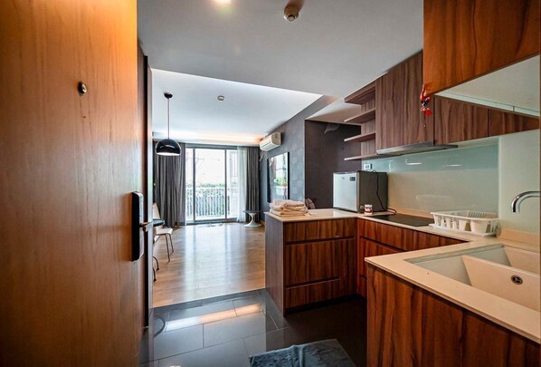 The building sits in a perfect spot - just a short walk to the BTS station, putting all of Bangkok within easy reach. Around the neighborhood, you'll find great cafes, restaurants serving both Thai and international food, and nice shops for your daily needs.