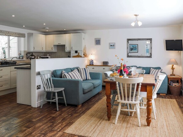 The ground floor is thoughtfully designed for relaxation and practicality. A bright, spacious kitchen-diner includes modern appliances, a large dining table, and comfy sofa seating ideal for family meals or planning adventures. The separate lounge offers a cosy retreat with plush sofas and warm décor, perfect for unwinding. A full bathroom with bath and shower is also located on this level.