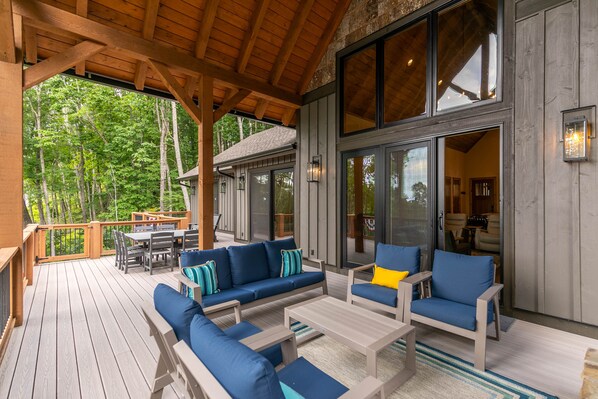 Step outside onto the deck to find covered seating with a second gas fireplace and TV, ideal for enjoying the serene mountain views. The deck also features a dining table and gliders, perfect for al fresco meals. Steps lead down to a lower area with a hot tub, providing a tranquil spot for relaxation. The property is further enhanced by a beautiful woodburning firepit surrounded by Adirondack chairs, offering a mountain experience under the stars.