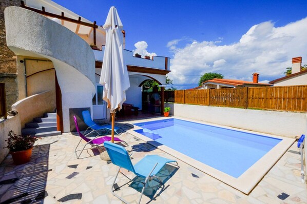 Das fĂŒr bis zu 6 Personen geeignete Haus KuÄa Paulotta liegt am Ortsrand von Rebici. Ăber eine geteerte Strasse erreicht man nach 2km den Strand von Rebici. Im Hof befindet sich ein 21 mÂČ Pool mit Sonnenliegen und Sonnenschirmen. Im Erdgeschoss befindet sich eine Terrasse mit Grill und rustikalem Holztisch mit Sitzgelegenheit fĂŒr bis zu 8 Personen. Die Terrasse mit Meerblick im, ĂŒber eine Aussentreppe erreichbaren, Obergeschoss, ist mit einer Rattansitzecke und Sonnenschirm ausgestattet.