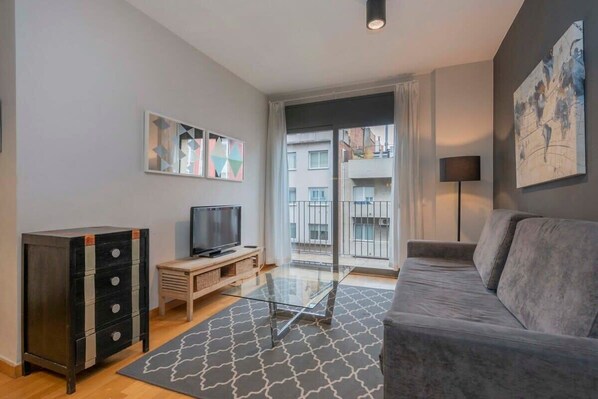 This apartment has a comfortable living room with a dining table, opened to a bright balcony, ideal for sunny days in Barcelona!