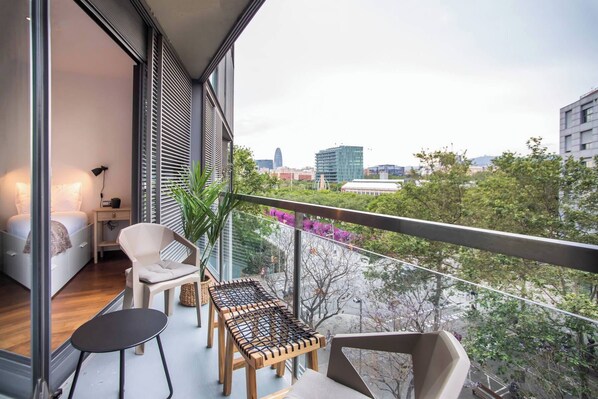 The private balcony completes the space, ideal for enjoying a morning