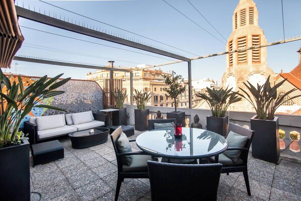 terrace serves as an outdoor lounge with a sofa and a dining area to