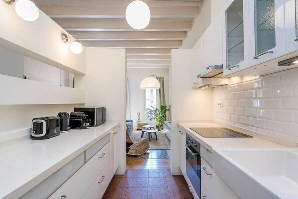 The kitchen and the living room are connected. The dining table can sit 8 guests and can also be extended, allowing you to have family dinner together while you are in Barcelona.