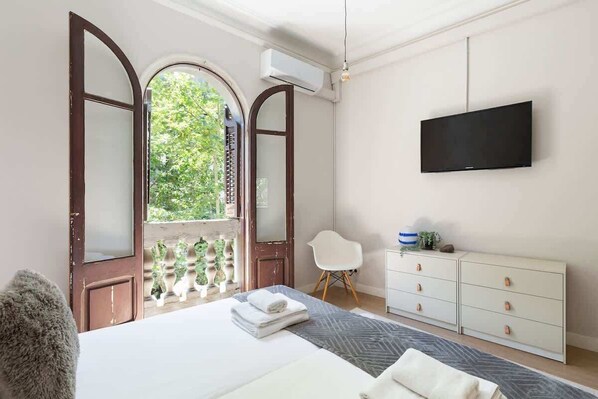 Moving to the other side of the apartment, you’ll find three bedrooms: one with a double bed, one with two single beds, and the master bedroom, which features a window overlooking the charming street below. For added comfort, air conditioning is available in the living room and the master bedroom.
