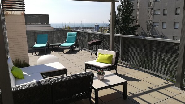 Terrassa de Mar ist eine Wohnung in einer Doppelhaushälfte von 62 m², ganz außen, ohne Gemeinschaftsräume oder Nachbarn im Gebäude, Haustiere erlaubt und Nichtraucher. Es befindet sich 2 Minuten zu Fuß vom Strand entfernt und hat eine private Terrasse von 60 m². Die Wohnung befindet sich im Zentrum des Dorfes Masnou, 17 km von Barcelona entfernt, mit schönem Blick auf den Hafen und ist komplett ausgestattet. 500 m vom Bahnhof entfernt, von dem alle 15 Minuten ein Zug zur Plaza Catalunya im Zentrum von Barcelona fährt. Kostenloses Parken.