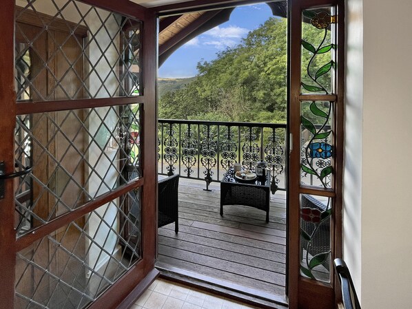 There's a private patio directly outside the property with seating and wonderful views and a covered balcony on the first floor. There is also a secure shared garden for exclusive use of guests of the 3 cottages (Gamekeeper's Cottage and two neighbouring holiday cottages, each sleeping 2).