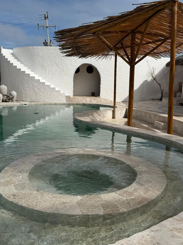 1 Außenpool mit Sonnenliegen und Sonnenschirmen