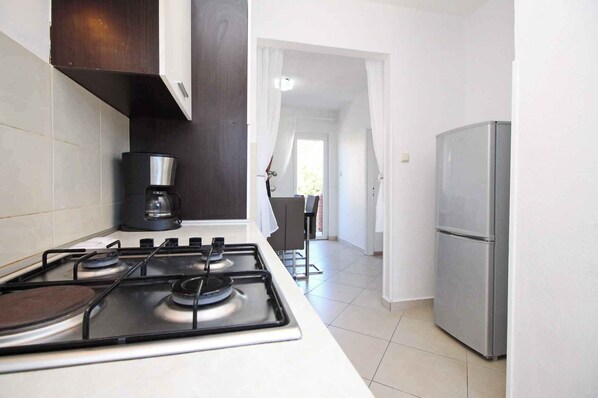und führt über eine Außentreppe. Wohnzimmer mit 1 Zusatzbett auf Couch/Sofa, Sitzecke, TV und Klimaanlage. 2 Schlafzimmer jeweils mit 1 Doppelbett. Küche mit Essecke, Gasherd (3 Flammen), Elektroherd (1 Platte), Backofen, Dunstabzugshaube, Geschirrspüler, Kühlschrank (Eisfach), Kaffeemaschine, elektrischem Wasserkocher und Zugang zum Balkon (10 qm, Gartenmöbel). Bad mit Dusche, 1 Waschbecken, WC und Fenster.