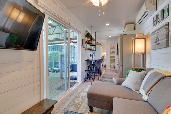 Forest Lane Acres presents an idyllic retreat for couples or small families looking for relaxation, social interaction and connecting with the outdoors. It boasts serene views of the pine forest from the covered patio deck, offering an exclusive oasis of privacy - you may detect the distant hum of neighbors, but they remain unseen. The outdoor area is equipped with WIFI, allowing you to work or play on your laptop amidst nature. Pet-lovers will appreciate the pet-friendly patio, fitted with retractable screens on all openings to ensure your furry companions remain safely within sight. Inside, the property is cleverly constructed from two shipping containers, providing a compact yet cozy living space of 540 square feet. Although the space is small, many amenities await, including a kitchenette, two full baths with showers, HD Smart TV in living and both bedrooms, and a full washer/dryer. This tiny house comfortably sleeps two on a queen bed and two on a full bed in the separate container. Additionally, we do have a “queen” sofa bed in the living room that’s great for one adult or a couple of kids.