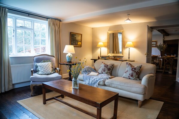 Stylishly restored, Garden Cottage blends antique charm with modern comfort, including a characterful inglenook open fire for cosy evenings. Sleeping up to six guests, the cottage offers three characterful bedrooms, two bathrooms, and a well-equipped kitchen. A private, enclosed garden surrounds the cottage, offering outdoor seating on the northern side for sunny mornings and on the southern side for relaxed evenings.