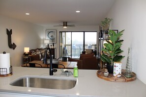 Diese Villa am Wasser bietet eine Küche und einen Balkon