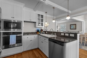 This coastal haven offers stunning views that both relax and revitalize. The open floor plan connects the living room, chef's kitchen, and dining room, creating a welcoming space for gatherings. Cook together, enjoy casual meals at the countertop bar, or host a formal dinner in the dining room.