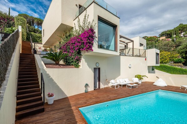Wunderschönes Doppelhaus mit privatem Pool und herrlichem Blick auf Sa Riera, Costa Brava. Es verfügt über eine Wohnfläche von 209 m² und bietet Platz für 11 Personen, mit mehreren Terrassen mit Meerblick. Der Strand von Sa Riera liegt 500 m vom Haus entfernt. Er ist direkt zu Fuß über einen privaten Weg am Ende des Gartens erreichbar. Das Haus ist auf zwei Etagen verteilt.Im ersten Stock befinden sich 4 Schlafzimmer: eines mit zwei Ausziehbetten und eigenem Bad mit Dusche, zwei Doppelzimmer (eines mit Doppelbett und eines mit Etagenbetten), ein Badezimmer mit Dusche sowie eine Suite mit Doppelbett, Badezimmer mit Dusche und Badewanne und Ankleidezimmer.Im zweiten Stock, die Treppe hinunter, befindet sich ein großes Wohn- und Esszimmer mit Zugang zur Terrasse, eine voll ausgestattete offene Küche mit Osmoseanlage, ein Doppelzimmer mit Etagenbetten, ein Badezimmer mit Dusche und ein Gäste-WC. Außerdem gibt es eine Terrasse mit Waschbereich. Über eine Außentreppe gelangt man zum Überlaufpool mit Salzwasser und zum Garten. In diesem Bereich befinden sich auch ein Chill-out-Sofa und -Tisch sowie ein Umkleideraum mit Dusche und Kühlschrank. Das Haus verfügt über WIFI und Klimaanlage in allen Räumen. Außenparkplatz für 2 Autos. Jugendgruppen sind nicht erlaubt. Bettwäsche, Handtücher, Küchentücher und Endreinigung sind im Preis inbegriffen. Für weitere Informationen zu dieser Immobilie stehen wir Ihnen gerne zur Verfügung.