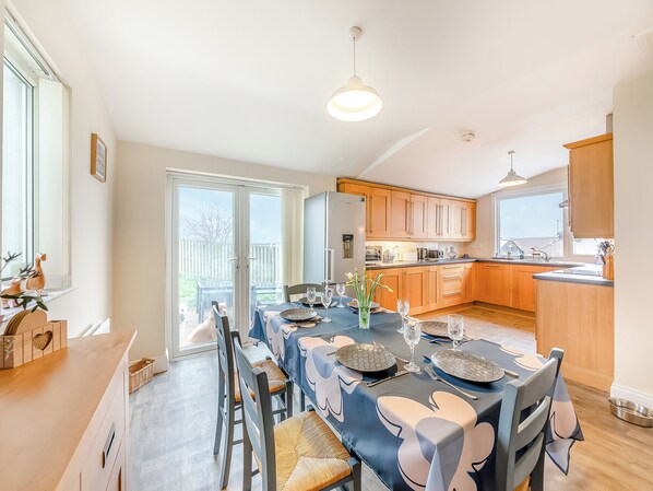 Upon entering the property, you are greeted by an open-plan kitchen and dining area, equipped with modern appliances including a dishwasher, washing machine, and everything you need to make your stay comfortable. A smart TV adds a touch of entertainment, and the space is perfect for shared family meals. The separate living room offers a cosy retreat with its wood burner and a smart TV, making it an inviting spot to unwind after a day of exploration. Large windows afford lovely views of the surrounding countryside, and the peaceful setting enhances the feeling of getting away from it all.