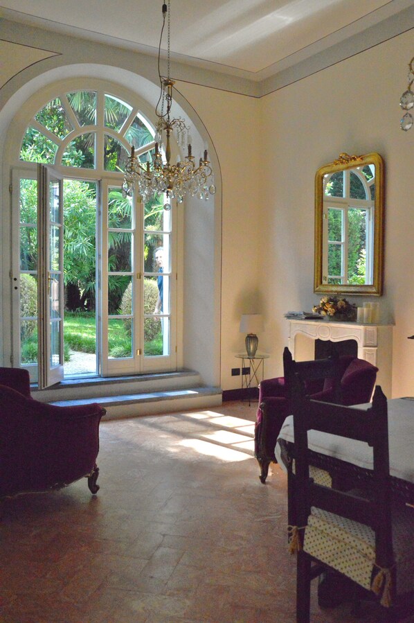 Die Wohnung verfügt über ein helles Wohnzimmer mit großen Fenstern mit Blick auf den Garten, lombardischen Terrakottaböden und Naturstein. Möbel aus der lombardischen Handwerkskunst des frühen 20. Jahrhunderts, Kamin im Pompadour-Stil, Pariser Spiegel und Drucke aus der Mitte des 19. Jahrhunderts.