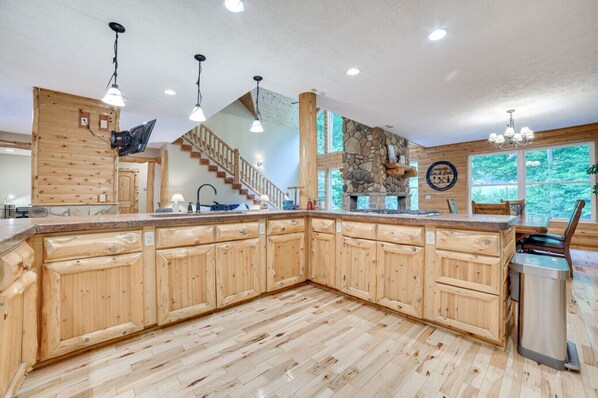 Alle Zimmer bei Family Cabin w Fire Pit Near Schuss Mtn bestechen durch Extras wie Kamine und eine Klimaanlage sowie Ausstattungsmerkmale wie Arbeitsbereiche und Schreibtischstühle.