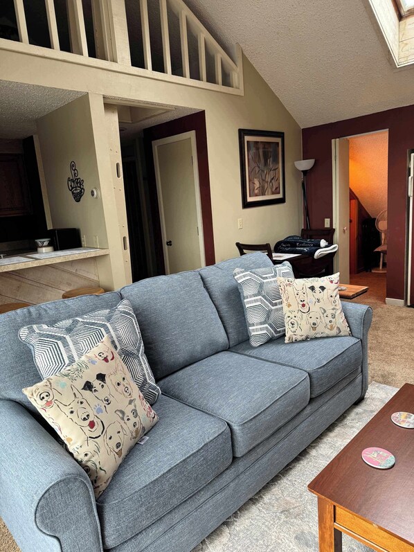 This bright and beautifully designed studio condo blends cozy lodge vibes with playful imagination. Dramatic cathedral ceilings and a large skylight fill the space with natural light, creating an open and airy feel from the moment you arrive.