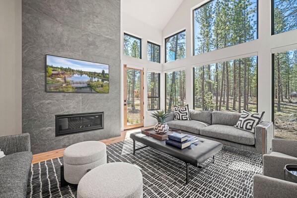 Thoughtful interiors embrace modern Pacific Northwest design and bring the outdoors in with floor-to-ceiling windows that provide natural light and showcase the Ponderosa pines surrounding the home. You’ll find an expansive great room with a gas fireplace for entertaining, a dining area and open chef’s kitchen equipped with stainless steel appliances and high-end finishes. Two patios offer extensive outdoor living space, with a dining area and a full-size hot tub overlooking protected woodlands.