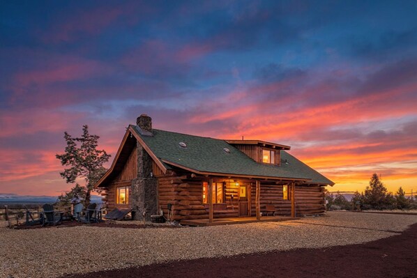 Imagine yourself at a rustic cabin in beautiful Central Oregon for your quiet getaway! This 1,600 sq. ft. 3 bedroom, 2 bath log cabin sits on 5 private acres, carefully renovated to give you and your family the comforts of home. Perched atop a butte, sweeping unobstructed views of the Cascade Mountain range welcomes you. The cabin's unique hand-scraped logs throughout all the rooms bring about an old charm that seemingly inspires calm and serenity. Lots of natural light brighten the cabin in time for your morning tea or coffee. At quiet times, you can hear the neigh of horses and whistle calls for working dogs to herd sheep. On occasion, you may hear the soft hum of a distant train passing by. Throughout the day, the landscape changes as its cool colors from the blue sky above, green grasslands and cream-colored fields below slowly darken to reveal the reds, pinks and purple of dusk. Sunsets here are so captivating! At night, many constellations appear across the open sky for your star-gazing enjoyment.