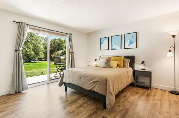 Just through the kitchen you'll find the private master bedroom, complete with its own bathroom. The queen bed is brand new, and perfect for catching some z's between action-packed days. You can watch tv from the bed or walk out the glass doors to the (second!) patio and have some background noise while sipping on some morning coffee. The bathroom connected to the bedroom is fully ADA compliant, with a walk-in shower and heated ceiling lamp. The entryway hosts a full bathroom as well, but the one in the hallway has a tub, offering you the best of both worlds!
