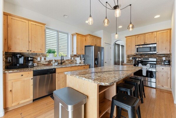 - Fully stocked kitchen with island seating, coffee maker, spices, and cooking essentials.