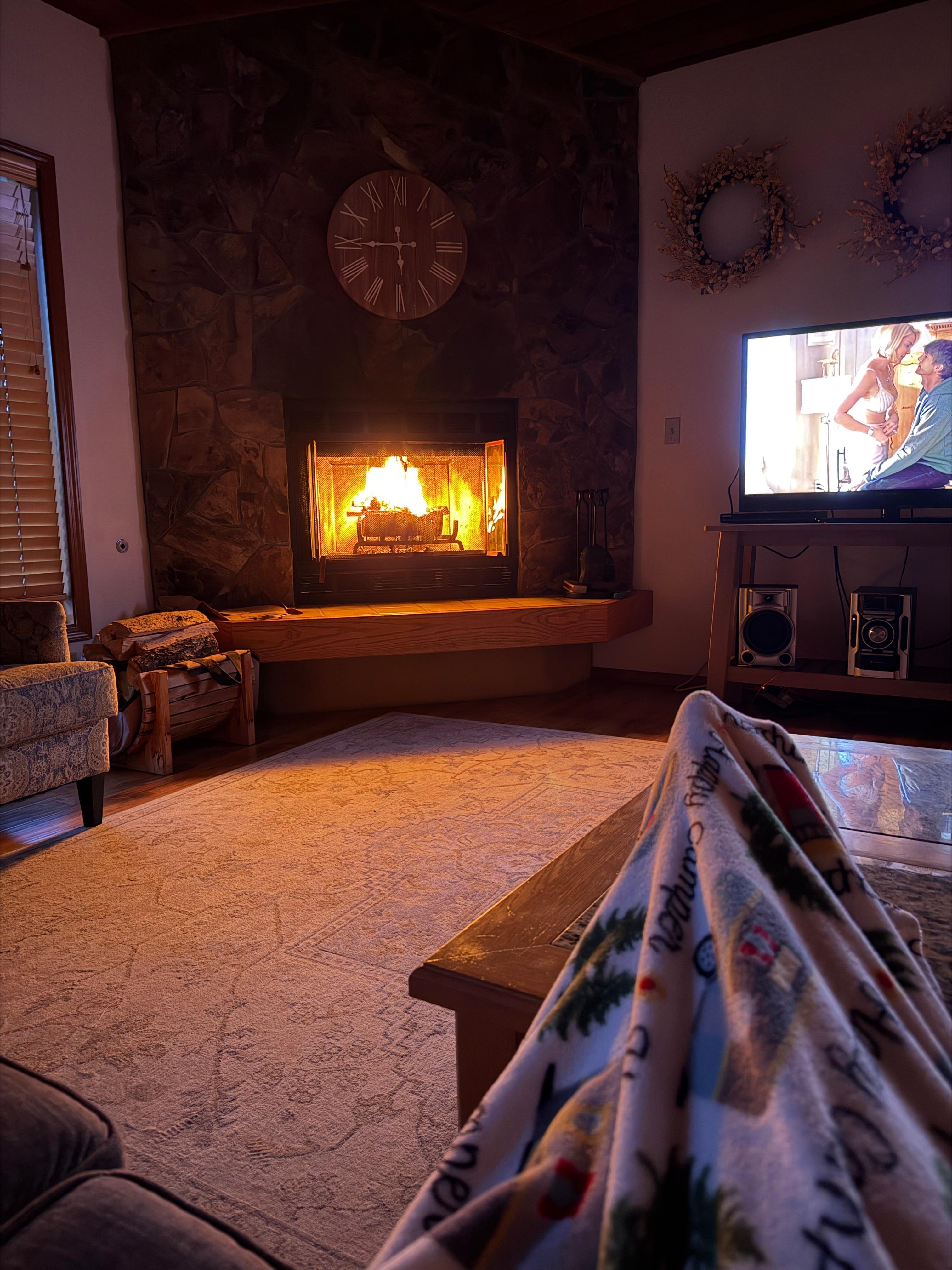 Das Wohnzimmer ist komfortabel mit übergroßen Möbeln, einem schönen Holzofen aus Lava-Stein im Lodge-Stil und einem HD-Flachbild-TV mit einem Blue-Ray-DVD-Player ausgestattet.