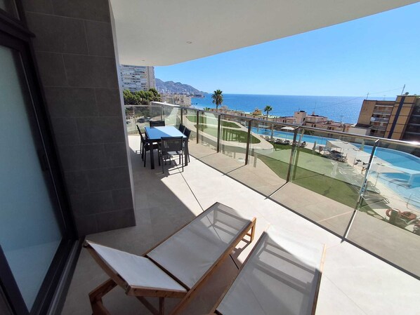 The spacious living room with large seating area and open kitchen offers immediate views of all the beauty Benidorm has to offer. From the spacious terrace you have even better views of the swimming pools, the Poniente beach and many more highlights. In the living room, you will find spacious seating areas as well as a SmartTV.