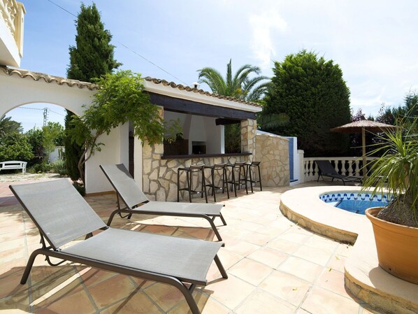 Benissa Costa: Schöne, gemütliche, komfortable Villa "Mi Sueno", auf 2 Stockwerken. 4.9 km vom Zentrum von Moraira, 6.7 km vom Zentrum von Calpe, im Bezirk Buenavista, ruhige, sonnige Lage im Villenviertel, 1.7 km vom Meer, 1.7 km vom Strand. Zur Alleinbenutzung: Grundstück, schöner Garten, Schwimmbad (4 x 8 m, 130 - 185 cm tief, saisonale Verfügbarkeit: 01.Jan. - 31.Dez.). Aussendusche, Poolhaus mit Kühlschrank und Kochherd, Gartenmöbel, Grill, Feuerstelle. Im Hause: Waschmaschine, Heizung nur verfügbar von 01.Nov. - 30.Apr.. Parkplatz (überdacht) beim Haus. Einkaufsgeschäft 6 km, Lebensmittelgeschäft 6 km, Supermarkt 6 km, Restaurant 1.5 km, Bushaltestelle 2.2 km, Sandstrand "Playa de La Fustera" 4.2 km, Badebucht 1.7 km. Golfplatz (9 Loch) 4.1 km. Nahe gelegene Sehenswürdigkeiten: Aqualandia, Mundomar, Terra Mítica, Terra Natura, Benidorm Palace (Benidorm).