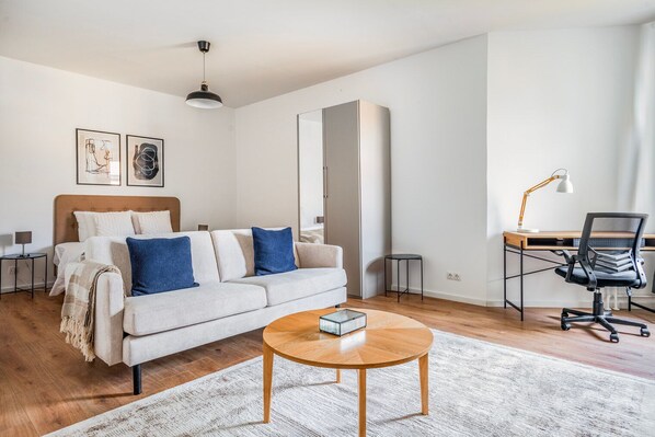 As with any Blueground apartment, you’ll find a thoughtfully designed space complete with beautiful furniture and a fully equipped kitchen in this studio property. And, thanks to our superior quality mattresses, luxury linens, and towels, you can relax knowing you’ll always feel comfortably at home. When you’re ready for some fun, you can take in the Berlin vibes or bring the entertainment to you with the premium wireless speaker or smart TV.