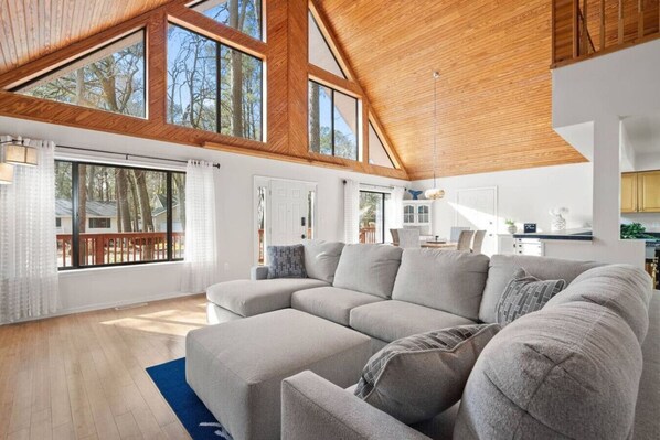 Upon entering the Ocean Pines Chalet, guests are immediately welcomed into the expansive main living area, where the eye is drawn upward to the stunning 40-foot vaulted ceilings that define the home's unique A-frame architecture. This open-plan space marries the living room with the kitchen, creating an inviting hub for socializing, dining, and relaxing. At the heart of the living area, a charming fireplace stands ready to warm chilly evenings, surrounded by an abundance of plush seating options, from sumptuous sofas to cozy armchairs, all arranged to foster conversation and togetherness. Natural light floods in through large windows, enhancing the sense of space and connection to the outdoors, while tasteful coastal decor echoes the serene environment of Ocean Pines.