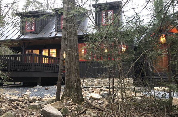 Our family of four had a great time at this newly built (or newly remodeled) "cabin" in the woods for a weekend away. Carpenter ants are cruising the grounds, making us think it's newly built and perhaps dislocated an ant colony in the process. They'll move on soon. The house had a good flow and open floor plan with an expansive outside seating area off the living room area and a neat private balcony in one of the bedrooms which was the best area to hear and see the stream. A separate bedding nook was off the stairs which our children loved or would be a great place for a quiet reading area.