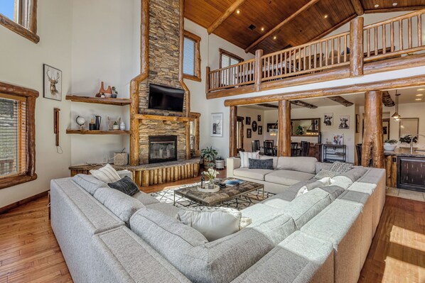 Step into the main living room, where vaulted wood-beamed ceilings and a massive stone fireplace set the scene for cozy evenings. The oversized sectional invites movie nights, while large windows frame breathtaking views of the natural surroundings. Whether you're whipping up brunch in the gourmet kitchen—with its large island, ample prep space, and barstool seating—or gathering around the circular dining table, the open-concept design makes it easy to stay connected.