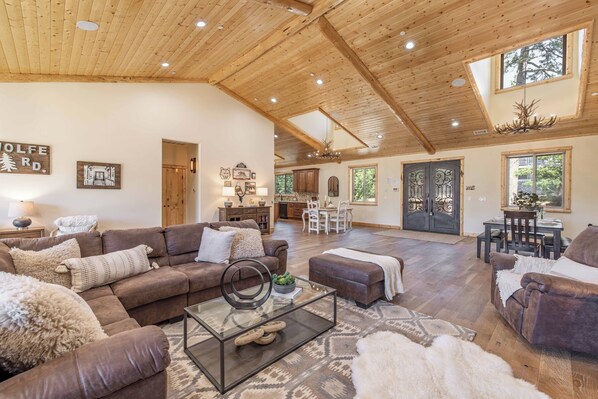 Highlights: • Sleeps up to 16 guests: Perfect for large families, friend groups, or multi-family getaways with spacious common areas and flexible sleeping arrangements. • 3 Master Suites: Each includes a private en-suite bathroom, with one featuring its own cozy fireplace — ideal for added comfort and privacy. Plus an additional bedroom with a bunk plus a full bed. • Huge Game Room: A lower-level lounge equipped with games, comfy seating, and a large TV — the ideal hangout space for all ages. • Two Expansive Decks: Enjoy a private spa with mountain views, BBQ grill, outdoor dining, and space to relax under the stars. • Two Fireplaces: One in the main family room for cozy group gatherings, and one in the downstairs master bedroom for a private fireside retreat. • Open-Concept Living: Stylish mountain decor, high ceilings, and a layout designed for entertaining and relaxation. • Chef’s Kitchen: Fully stocked with stainless steel appliances, granite countertops, a large island, and everything you need to cook and dine at home. • Prime Location: Quiet forest setting just minutes from skiing, hiking, the lake, and Big Bear’s best shops and restaurants.