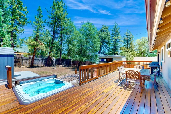 Take your pick between a gas and charcoal grill and throw a cookout on the large new deck. While dinner sizzles, relax in two chairs shaded by a large umbrella. Share meals at the four-person table. As evening falls, soak in the private hot tub or gather around the fire pit. Solar lights illuminate the deck, patio, and hot tub. Additional outdoor space includes a front porch with seating for five and a gate that can be completely closed off. A basketball hoop hangs above the driveway. In the garage you'll find a provided basketball as well as a ping-pong table and a card table for two.