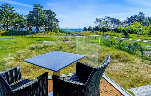 Die Ferienwohnung über zwei Etagen (EG und 1. OG) verspricht eine hochwertige Genuss- und Wohlfühlatmosphäre. Dank eines separaten Eingangs bietet sie besonders viel Privatsphäre. Exklusive Möbel wurden perfekt aufeinander abgestimmt und stehen für ein Lebensgefühl, das Harmonie und Eleganz vereint. Jedes Möbelstück und Wohnaccessoire ist sorgfältig ausgewählt, nichts wurde dem Zufall überlassen. Insbesondere auf ein gesundes Raumklima und allergikerfreundliche Materialen wurde geachtet. Sowohl auf der teilweise überdachten, 17m2 großen Terrasse als auch auf dem kleinen Balkon lässt sich abendliche Ostseeluft ganz privat genießen.