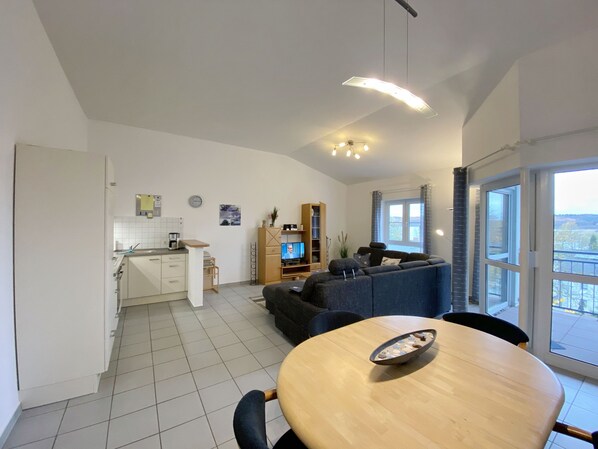 Die hell und freundlich eingerichtete Nichtraucherwohnung umfasst ca. 67 qm und bietet Platz für max. 4 Erwachsene und 1 Kleinkind bis 3 Jahre im Kinderreisebett. Die 2 Raumwohnung im 2. OG ist sehr großzügig geschnitten und verfügt über ein Schlafzimmer mit einem Doppelbett (1,60m x 2,00m), Nachtischkonsolen, Kleiderschrank sowie einem Etagenbett (je 0,90m x 2,00m). Im Wohn-/Essbereich finden Sie einen Esstisch mit Stühlen sowie eine gemütliche Couchecke (mit Ausziehfunktion 1,10m x 2,00m, eine Rollmatratze, die auf die Couch gelegt werden kann, erhöht den Schlafkomfort), Tisch, Anrichte sowie Flachbild-TV und Mini-Stereo Anlage. Angrenzend haben Sie die komplett ausgestattete Küchenzeile mit Geschirrspüler, Kühlschrank + Eisfach, 4 Zonen-Ceranfeld mit Backofen, Kaffeemaschine, Mikrowelle, Toaster und Wasserkocher sowie diverse Küchenutensilien. Das Bad ist komplett mit Marmorfliesen versehen und verfügt über eine Dusche, Waschtisch, Kosmetikspiegel, Fön und WC. Der überdachte Balkon, den Sie durch den Wohnbereich erreichen, lädt mit seinem schönen Blick auf den Schmachter See ein, um Ihren Urlaubstag in Ruhe ausklingen zu lassen. Alle Räumlichkeiten sind gefliest und der Wohnbereich sowie das Schlafzimmer sind durch Außenrollos verdunkelbar. Ein Wlan-Zugang ist für Sie inklusive. Ein kleiner Fahrradkeller sowie zusätzlich teilweise überdachte Fahrradständer stehen Ihnen zur Verfügung. Ein Stellplatz gehört zu Ihrer Wohnung dazu. Die Nutzung einer Wallbox mit 11KW Ladeleistung ist nach Verfügbarkeit und Voranmeldung vor Ort möglich. Bedingungen und FAQ`s sind vor Ort einsehbar. In einem Gemeinschaftsraum können Sie gegen eine Extragebühr Waschmaschine und Trockner nutzen. Für unsere kleinen Gäste sind 1x Kinderhochstuhl und 1x Kinderreisebett (ohne Matratze und Bett Inlett) inklusive. Die Erstausstattung eines Wäschepaketes (komplette Bettwäsche, 1 Duschhandtuch, 1 kleines Handtuch) können Sie bis 14 Tage vor Anreise gegen einen Aufpreis dazu buchen oder durch eigene ergänzen. Ab 2 gebuchten Paketen erhalten Sie einmalig 1 Geschirrhandtuch und 1 Duschvorleger hinzu.