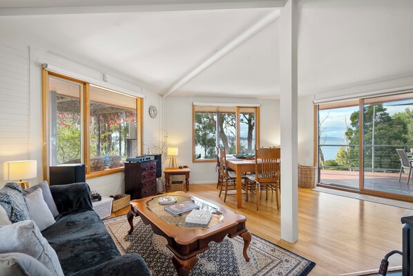 The spacious and fully equipped kitchen is open plan with several lounge seating areas, the dining area, and direct access via glass patio doors onto the deck. There is a smart TV, reverse cycle heat pump, and fast internet. Cook up a Tassie gourmet feast in the well-equipped kitchen, and enjoy that remarkable view.