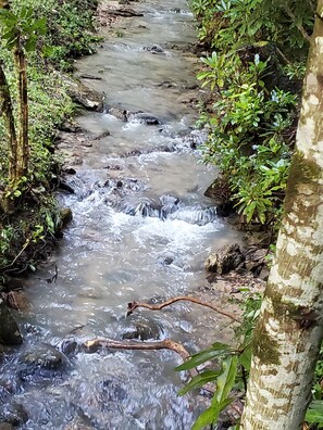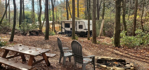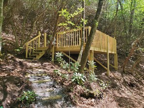 We are offering our Hillside Deck for only $53 per night (one tent, 2 adults). Enjoy easy and clean tent camping in the woods on our 5 acre property. Depending on the time of year the Hillside Deck enjoys a view of the 900 foot creek that meanders along the length of the property. Your accommodations are set up on a sturdy smooth, level, elevated deck. This site offers privacy surrounded by trees and away from other campers yet close enough to conveniences of a more expensive campground. This is private property and not a commercial campground. The Hillside Deck is situated 300 feet from a fire pit, picnic table, bathroom/shower and limited kitchen. We also have a Berkey water filter so you can fill up with potable water. One parking space next to the Deck can accommodate a small vehicle, 4WD recommended after heavy rains. A larger vehicle may park at the resident's driveway area.