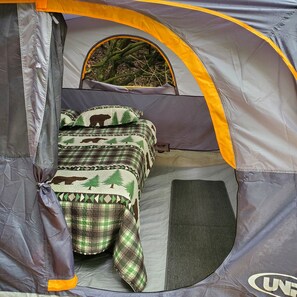 Inexpensive accommodations in the Black Mountain area. Relax in a large tent equipped with a new cot and air mattress. Located on our wooden Hillside Deck. Small enclosed bathroom in a tent nearby and a full bathroom with shower available just 300 ft. away in our "clubhouse."