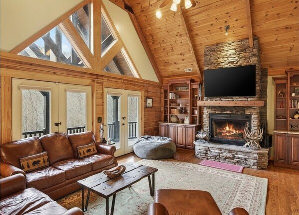 • Impressive great room with TV for streaming, wood-burning fireplace, and access to the covered deck with additional dining and seating