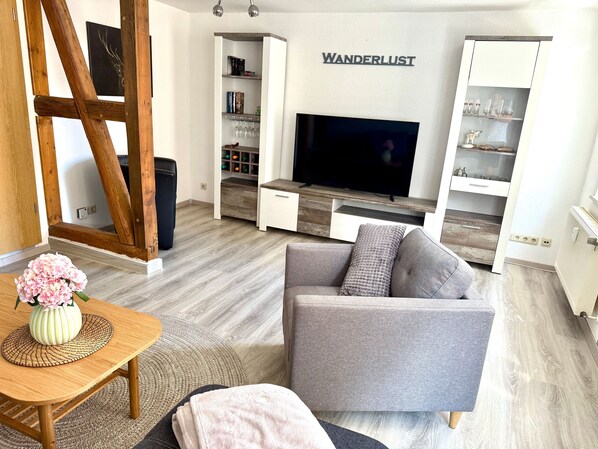 Unsere Ferienwohnung Wanderlust ist der ideale Rückzugsort nach einem Tag voller Erlebnisse im Harz. Das Wohnzimmer mit sichtbaren Fachwerkbalken versprüht historischen Charme, während im Schlafzimmer ein komfortables Boxspringbett für erholsame Nächte sorgt. Das helle Bad ist mit Dusche und WC ausgestattet, dazu gibt es eine praktische Küche mit Sitzecke sowie einen einladenden Flurbereich. Alle Räume sind liebevoll und wohnlich eingerichtet. Zur Wohnung gehört außerdem eine Sitzecke im Garten, die zum Entspannen im Freien einlädt.