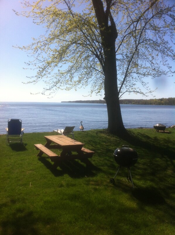 The movable picnic table outside was our breakfast, lunch and dinner spot, always moving either into shade or sun, depending the time of the day. Also relaxed with a book on the lawn chairs, or enjoyed some badminton on the lawn. The inside is comfortable as well with all the recliners - and the screened in porch was very helpful at night. As others mentionned, there is no AC but if closing windows and shades/ curtains early in the morning it can be managed. One thing to mention which could be disturbing to some, route 13 is relatively close and the traffic is noticable, especially with open windows in summer.