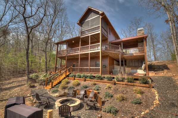 The cabin is located less than 3 miles from Downtown Blue Ridge, for shopping and dining. If you are looking for something with paved roads, easy access, then this is it! No Agenda boasts 2 beautiful queen bedrooms, 2 sets of twin beds and a queen sleeper sofa in the game room. The master suite offers an oversized jacuzzi tub. The outdoor entertainment areas are endless with two firepit areas and plenty of covered deck space to relax and unwind. New hot tub to soak off the days adventure of mountain biking or hiking. Come see what the fuss is all about at No Agenda.